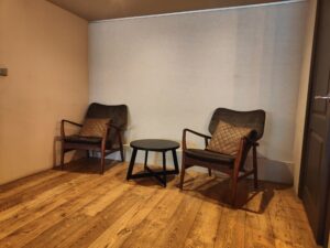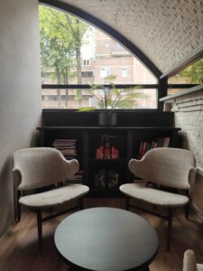 Not inside the building (it’s a railway arch), but there is a wide and safe pavement where you can gather.